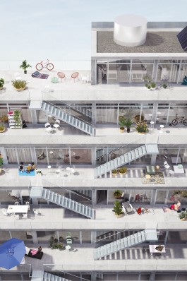 The brief for this international design competition for a cooperative housing project asked for an architecture that would allow for a communal living together of different age groups, people with different backgrounds and demands (refugees, singles and families) while offering affordable rents and maximally efficient plans. The building site: On the corner of a yet to be developed block in the middle of Munich's new 350-hectare Freiham development area. The context: A masterplan made of slabs, zig-zag and court-yard types, grey coloured in rectangles on optimistic lavish green plots - the worst is to be expected.