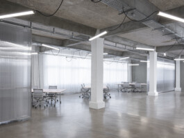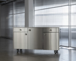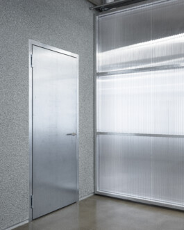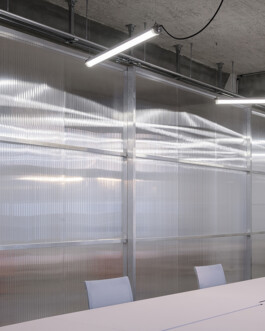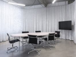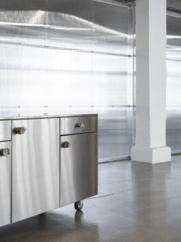 This conversion of an old factory into an office is centred around the notion of flexible and adaptive use. Aluminium sliding doors, movable tables, and a service trolley allow for a reconfiguration of the office layout, catering to different needs and events. High-performance acoustic surfaces applied to walls and ceilings enable a free reconfiguration of all appliances without compromising user comfort.
